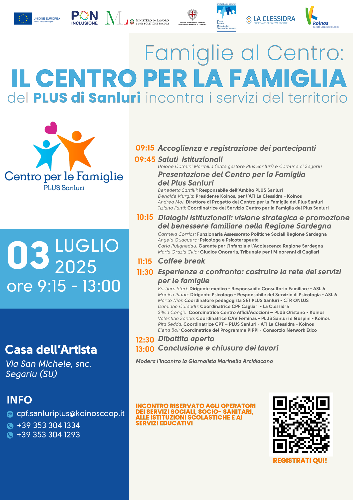 L’evento, promosso dal Centro per Famiglie del Plus Sanluri, si è aperto con i saluti istituzionali dell’Unione Comuni Marmilla, del Comune di Segariu e dei rappresentanti del Centro stesso, tra cui Benedetta Santilli (Responsabile dell’Ambito PLUS), Andrea Moi (Direttore di Progetto), Tiziana Fonti (Coordinatrice del Servizio), Denaide Murgia (Presidente di Koinos) e Dimitri Pibiri (Presidente della Cooperativa La Clessidra), che ha anche moderato i lavori.
